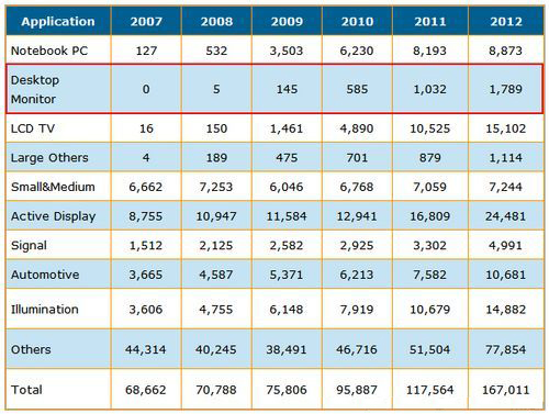 根據(jù)上表中專業(yè)市場(chǎng)調(diào)研機(jī)構(gòu)Displaysearch近期發(fā)布的LED出貨量預(yù)估報(bào)告我們可以看出,在未來幾年被應(yīng)用于顯示器產(chǎn)品背光模組的LED將會(huì)有爆發(fā)式的增長。2012年估計(jì)LED背光將被廣泛地應(yīng)用在1寸到70寸液晶顯示設(shè)備,同時(shí)有340億顆LED會(huì)用于液晶顯示產(chǎn)品背光,與2008年比較成長將超過300%。