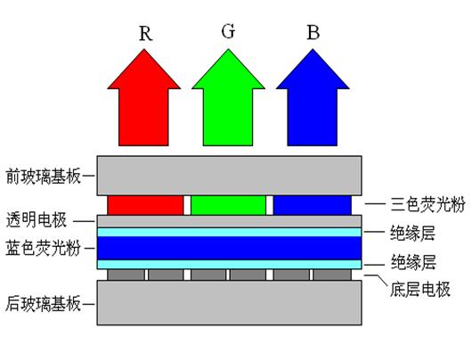 PDP是Plasma Display Panel的簡寫,也就是等離子體顯示器。PDP顯示器的工作原理是,通過加電,讓等離子汽體(一般為惰性氣體)在強(qiáng)電場中放電產(chǎn)生紫外線,然后通過紫外線激發(fā)熒光粉發(fā)光,PDP顯示器的工作原理如圖5所示,其結(jié)構(gòu)如圖6所示。