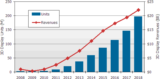 根據DisplaySearch最新發表“3D顯示器技術與市場預測分析專題報告“中顯示,預估立體3D顯示器市場將從2008年的70萬臺,共9億零2百萬美元的出貨金額,到2018年將成長到1億960萬臺,共220億美元的出貨金額;其出貨量年度復合成長率(CAGR)達75%,而產值的年度復合成長率(CAGR)則為38%。