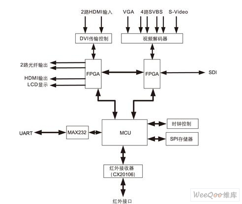 根據LED顯示屏需具有較高的顯示性能和效果,以及方便控制的需求,顯示屏控制系統應具有足夠的輸入、輸出接口和遠程通信功能。我們基于HDMI1.3技術的LED顯示屏控制器的系統結構如圖1所示。系統按功能可分為以下幾個模塊:6路模擬量輸入、2路DVI輸入、1路VGA輸入、RS-232和RS-485通信、光纖數據傳輸、實時時鐘以及狀態指示等。