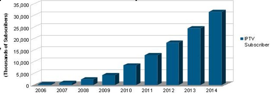 據iSuppli公司,2010年通過互聯網和寬帶網絡提供的IPTV用戶數量將增到850萬個,比2009年的440萬大增96%。iSuppli公司估計,雖然未來三年的增長率不會保持在2010年的高峰水平,但IPTV將繼續迅猛發展,增長率將高達51%。到2014年,中國的IPTV用戶將超過3100萬個。