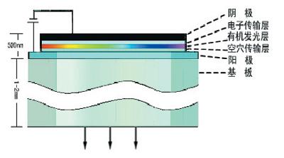 OLED是指有機半導體材料和有機發光材料在電場的驅動下,通過載流子注入和復合導致發光的技術。其原理是用ITO玻璃透明電極和金屬電極分別作為器件的陽極和陰極,在一定電壓驅動下,電子和空穴分別從陰極和陽極注入到電子傳輸層和空穴傳輸層,然后分別遷移到發光層,相遇后形成激子使發光分子激發,后者經過輻射后發出可見光。輻射光可從ITO一側觀察到,金屬電極膜同時也起了反射層的作用。下圖是一個簡單的OLED器件結構示意圖。