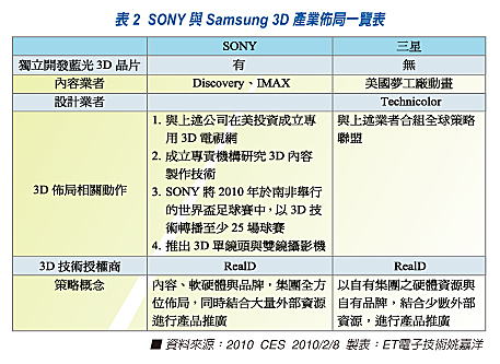 然而,消費者要的不是一臺高科技電視,更要豐富的閱聽內容。以3D影像產業而言,除了需要強大硬體裝置支援外,其豐富的3D內容支援也是相當重要的。09年的CES展,許多大廠開始拉攏平臺與內容業者一同站臺,因為他們知道光是只有硬體不能讓消費者買單,多元的加值服務才是消費性電子未來的趨勢。2010年的CES展,同樣也是依循前年的模式,而且力道更加強勁,以補強各自提出自有的硬體解決方案。另一方面,以SONY與三星來說,兩家公司同時都與RealD技術合作以獲取3D的專利技術,以避免專利侵權的問題發生,就以產業現況來看,頗有烘抬3D產業的味道(見表二)。