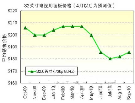 - 預(yù)計(jì)2010年第三季度32英寸用面板價(jià)格為180~185美元左右