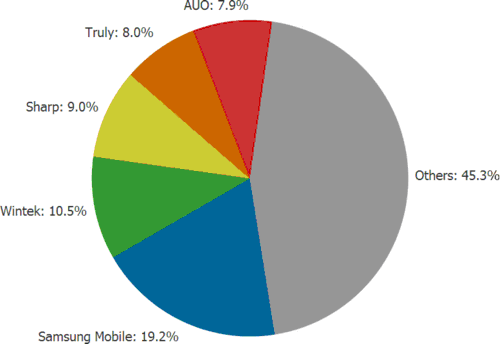 下圖顯示了全球前5大手機(jī)面板供貨商的市占率,前五大廠商占有超過(guò)一半市場(chǎng)。三星排名第一,2009年出貨量市占率達(dá)19.2%,其次是勝華科技市占率10.5%,夏普排名第三市占率9.0%,信利與友達(dá)以8.0%及7.9%市占率分居第四與第五位 。
