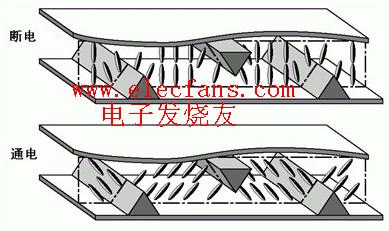如圖,它依*叫做Protrusion的屋脊狀凸起物來使液晶本身產生一個預傾角(Pre-tiltAngle)。這個凸起物頂角的角度越大,則分子長軸的傾斜度就越小。早期的VA模式液晶凸起物只在一側,後期的MVA凸起物則在上下兩端。