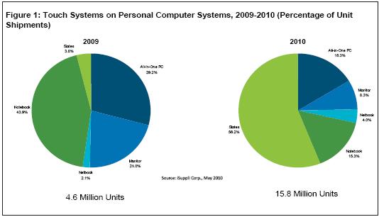 最近幾年,個(gè)人電腦市場對于觸摸屏的需求不斷增長,2008和2009年增長率超過20%,快于總體系統(tǒng)市場。但與該市場2010年462%的增長率相比,上述增長速度就相形見絀了。平板觸摸電腦是PC觸摸革命中的主要初期推動者,預(yù)計(jì)占PC觸摸市場的比例將從2009年的3.8%銳升到56.2%,而總體PC觸摸市場規(guī)模將擴(kuò)大兩倍。