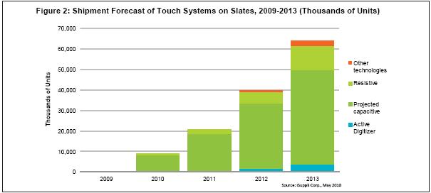 圖2所示為iSuppli公司對于2009-2013年平板電腦市場觸摸系統(tǒng)的預(yù)測。
