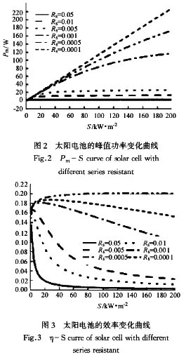 由前面太陽電池的等效電路可以看出,串聯內阻會降低短路電流,降低負載兩端的電壓,引起電池轉換效率的下降。圖2和圖3分別為不同串聯內阻的太陽電池峰值功率和轉換效率隨光強的變化規律。從圖中可以看出,隨著光強的增加,串聯電阻的影響越來越顯著,串聯內阻越高,隨著光強的升高,其轉換效率下降的越快。