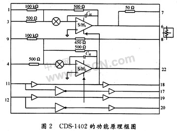 在CCD的應用領域中。相關雙采樣電路得到了廣泛的應用。很多公司專門研發了相關雙采樣的集成電路芯片。這些專用芯片不僅使用方便,且性能也能得到很大的提高。CDS1402芯片是一種典型的相關雙采樣電路芯片,它是專門為CCD成像器件研制的,用來消除復位噪聲。CDS1402進行了優化,適合用于10~14位轉換精度的數字視頻。低噪聲的CDS1402芯片也是利用對高低電平信號的采樣并相減來精確確定視屏信號的。結果在CCD輸出的浮動電容器上,那些剩余電荷和kTC噪聲被最大限度的消除。CDS1402芯片一共有24個引腳。它包含有2個獨立的采樣保持放大器和S/H電路,每個S/H電路都有獨立的控制線,輸人和輸出管腳,有兩個管腳提供偏置調流和調壓。一般來說,CCD的輸出信號都要連接到2個S/H的輸入端,S/H1端用來采集和保持偏置信號,它的輸出值與CCD輸出信號相減,當CCD輸出偏置+視頻信號的時候,S/H2端就進入信號的采集狀態,從而獲得有用的視頻信號。