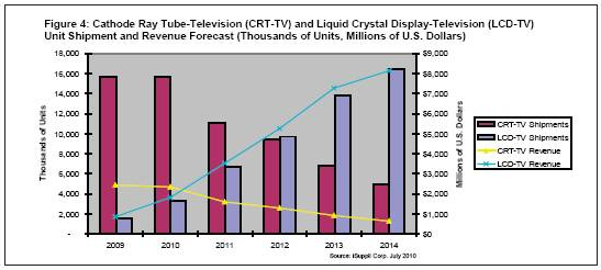 同時,CRT電視的單位出貨量將在2012年降到940萬臺,而2011和2010年分別為1110萬和1570萬臺。同時,液晶電視出貨量將在2012年上升到970萬臺,而2011和2010年分別是660萬和330萬臺。