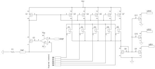 為了在LED中實現精確及穩定的正向偏置條件,通過與帶隙參考提供的恒定電壓相關的外部電阻產生一個參考電流。與運算放大器U1相關的晶體管Q1在Vref引腳產生恒定輸出電壓。Vref和地之間連接的外部電阻產生流經Q1和Q2的恒定電流。這個電流這時候就被Q3~Q7的晶體管系列建立鏡像和放大,每個電流被連接至開關S1~S5,并且被晶體管Q8相加。最后,晶體管Q9復制參考電流至LED1。這種結構針對每個LED進行復制,而芯片的布局經仔細分析,以優化每個LED之間的匹配。