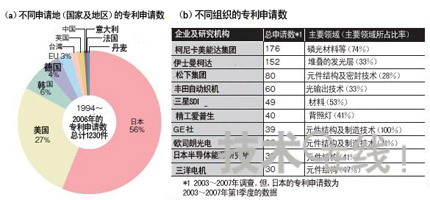 圖日本廠商在開發(fā)方面領(lǐng)先圖為Cintelliq公司就以實(shí)現(xiàn)有機(jī)EL照明為目的的專利申請數(shù)所做調(diào)查的結(jié)果。按申請地劃分,日本為56%,大大超出排在第2位的美國,遙遙領(lǐng)先(a)。在本圖中,1994~2006年的專利申請數(shù)通過2003年以后的文獻(xiàn)調(diào)查得到。按不同組織劃分,柯尼卡美能達(dá)集團(tuán)為176件,排在第1位(b)。大約3/4的專利與藍(lán)色磷光材料有關(guān)。(b)為2003~2007年有機(jī)EL照明(包括背照燈)專利按組織劃分的申請數(shù)(前10家公司)及主要領(lǐng)域。由于按組織劃分的日本專利申請數(shù)數(shù)據(jù)中不包含2007年第2季度以后的數(shù)據(jù),因此,實(shí)際上日本企業(yè)的申請數(shù)有可能更多。