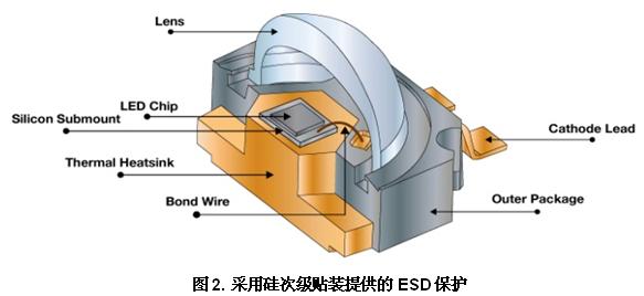 圖2顯示了如何在LED和引線框之間應用硅次級貼裝來更緊密地集成ESD保護。這種構造使LED外形尺寸更緊湊;次級貼裝替代側面貼裝LED模塊中使用的傳統襯底,提供的ESD保護等級超過15 kV HBM。硅次級貼裝的良好熱傳導性也幫助LED緩解由于LED與引線框熱膨脹系數不同導致的應力。