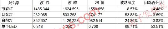 在實驗中,我們利用瞬態光度計對26W螺旋型電子節能燈,60W普通直管型日光燈,60W普通白熾燈,單個紅色LED等四種典型的照明光源測量其光通量的變化波形,計算波動深度。在PR110中,我們設定采樣間隔為0.1ms,所有燈都采用50Hz交流電供電,測量結果如表1。