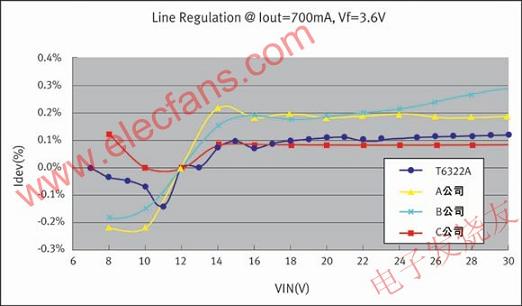 圖1對T6322與其它產品的功率轉換效率進行了對比。圖2是T6322與其他產品的線路調整能力的對比(低電流變動率即表示高線路調整能力)。