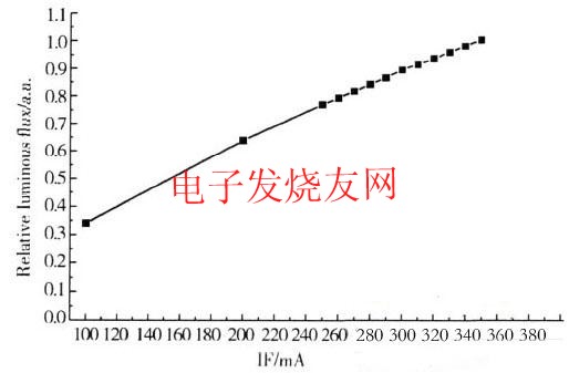 從圖2中可以看出,隨著器件的驅動電流增加,功率型白光LED的色溫從100mA電流時的5636K增加到350mA電流時的5734K。這是因為,電流加大后,芯片發出的藍光增多,熒光粉層的厚度是一定的,則在出射的白光中藍光成份增加,從而使器件的色溫增加。