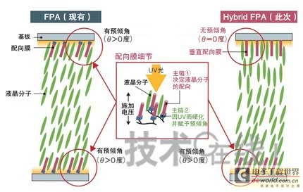 索尼開發出實現了液晶面板高速響應的顯示技術“Hybrid FPA”。采用對一側基板賦予預傾角,而使另一側基板呈垂直配向狀態的構造。與現有對兩側基板均賦予預傾角的FPA相比,可提高電源導通/關閉時的響應速度和對比度(圖根據索尼的資料制作)