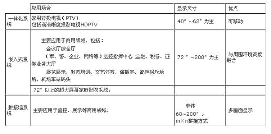 在實現大畫面顯示(顯示尺寸在40英寸以上)方面,常見的產品有:LED顯示屏、投影顯示(正投、背投、投影拼接墻)、PDP顯示,在超大屏幕顯示(顯示尺寸在72英寸以上)方面,目前主要有LED顯示屏和投影顯示,以下是幾種顯示方式的比較。