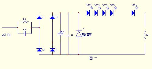 在圖三電路中﹐C1﹑R1﹑壓敏電阻﹑L1﹑R2組成電源初級濾波電路﹐能將輸入瞬間高壓濾除﹐C2﹑R2組成降壓電路﹐C3﹑C4﹑L2﹑及壓敏電阻組成整流后的濾波電路。此電路采用雙重濾波電路﹐能有效地保護LED不被瞬間高壓擊穿損壞。