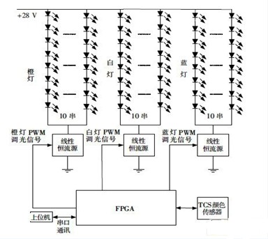 以FPGA作為控制器,根據上位機的調光指令調整PWM 占空比,從而控制背光亮度;采樣顏色傳感器的數據,微調橙燈和藍燈的PWM 占空比,保證在溫度發生變化時色溫不變。