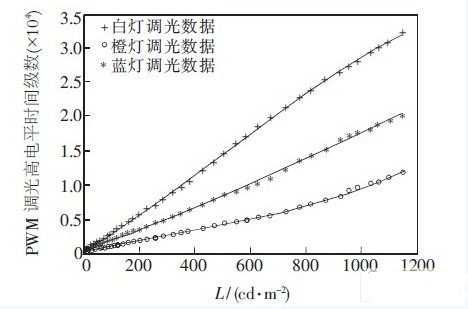 圖3為SS-230平板顯示綜合分析系統的照片。實驗時,調白光從低亮度到高亮度,橙燈和藍燈也按比例逐漸增加,保證色溫在(6 500±30)K,色坐標u′=0。198,v′=0。468。記錄從低亮度到高亮度調光過程中,白燈、橙燈和藍燈的調光PWM波形高電平持續時間的數據,共記錄40組數據。
