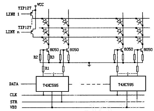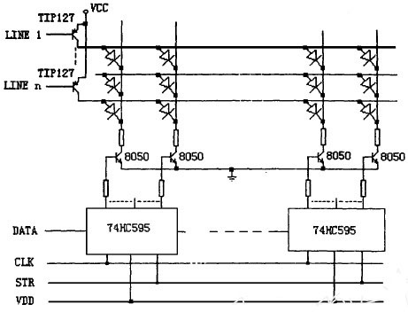 常規型驅動電路的設計一般是用串入并出的通用集成電路芯片如74HC595或MC14094 等作為列數據鎖存,以8050 等小功率NPN 三極管為列驅動,而以達林頓三極管TIP127等作為行掃描管,其電路如圖1 所示。