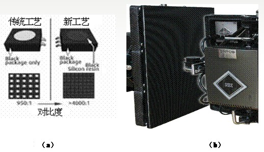 如圖1所示,(a)左側(cè)為傳統(tǒng)工藝的LED發(fā)光管。一般為黑色面碗LED發(fā)光管,管芯為白色。(a)右側(cè)為Barco公司采用新技術,使用黑色管芯,有效提高了對比度指標。(b)圖為采用新工藝的P4間距SMD顯示屏模組。