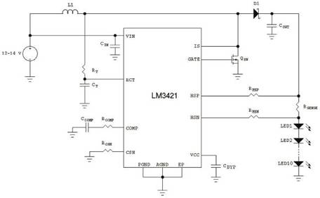 圖1使用LM3421的升壓穩(wěn)壓器驅(qū)動(dòng)10個(gè)LED