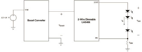 根據(jù)具體的設(shè)計(jì),上述問(wèn)題的影響可能可以忽略。但是,如果系統(tǒng)設(shè)計(jì)師對(duì)上述影響存有顧慮,可以采用單個(gè)串聯(lián)燈組作為首選拓?fù)浣Y(jié)構(gòu)。在這種解決方法中,仍可以使用LM3406等部件,但將增大系統(tǒng)復(fù)雜性,因?yàn)樾枰虑岸瞬考糜趥鬏敵?2V~14V的電源電壓為L(zhǎng)ED驅(qū)動(dòng)器供電。然后,LED驅(qū)動(dòng)器降低此新電壓,為單個(gè)LED燈組供電。這可以通過(guò)在直流電源和LM3406之間增加升壓DC/DC功率級(jí)輕松實(shí)現(xiàn),如圖10所示。通過(guò)此拓?fù)浣Y(jié)構(gòu),串聯(lián)燈組中的所有LED均具有相同的電流,無(wú)論各LED的VF值是多少。
