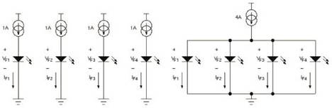 下例顯示了VF變化的影響。在實(shí)驗(yàn)中,使用圖9所示兩種設(shè)置收集數(shù)據(jù)。一種設(shè)置用于4個(gè)LED,另一種設(shè)置用于并聯(lián)的4個(gè)LED。表1所示數(shù)據(jù)在25℃加電后5秒內(nèi)測(cè)得,以最大限度降低LED自發(fā)熱的影響、
