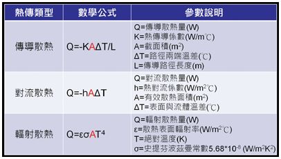 在了解散熱之前還要知道熱歐姆定理,傳統的電流歐姆定理:V=IR,壓降=電流×電阻,電阻愈大,壓降就愈大,表示電壓在元件中消耗量愈大;同樣的,熱歐姆定理:ΔT=QR,溫差=熱流×熱阻,當熱阻愈大時,就有愈多的熱殘留在元件內,這說明了散熱效果要越好,熱阻就要越低。 熱歐姆定理是以熱阻(Thermal resistance)將熱傳以物理量量化,計算方式為LED介面溫度與室溫的溫差除以單位輸入功率。 簡單來說,如熱阻為10℃/W,表示每輸入1W的能量會是LED上升10℃。