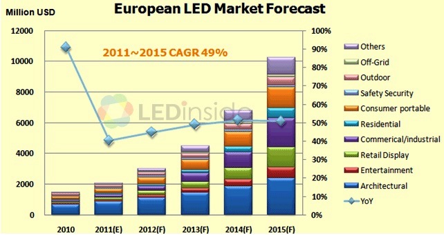 根據(jù)LEDinside調查, 2011年歐洲 LED照明市場約達20億美元以上,大約占全球 LED照明市場28%。盡管歐洲市場因為歐債而在 2011年有受到影響,但歐盟已經積極解決,也反應在市場上,隨著LED規(guī)格不斷的提升及大幅度降價等影響,LEDinside預估歐洲 LED照明市場每年都將會有大幅度成長,2015年歐洲 LED照明市場將會突破100億美元規(guī)模。