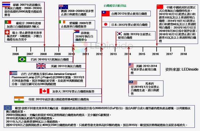 各國禁用白熾燈泡時程比較表
