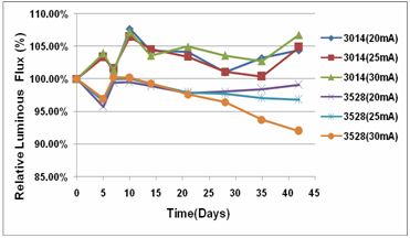 隨機抽取3528LED和3014LED各30pcs,按驅動電流20mA、25mA、30mA各分為三組進行1008H的光衰實驗,以比較分析兩種不同散熱模式LED的光衰和色坐標漂移程度,從而研究散熱對其光色特性的影響。