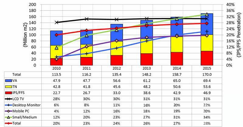 圖1:分模式的TFT液晶面板市場(按面積計算)和IPS/FFS普及率