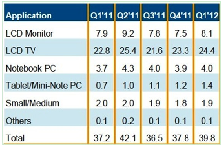 友達、新奇美、京東方、華映和瀚宇等廠商計劃于 2012年將更多資源投入到生產平板電腦面板上。盡管五代線和更低世代線主要以生產小筆電和平板電腦面板為主,但到 2012年第一季,預期有超過一半的小筆電和平板電腦面板將放在六代線和八代線上生產。