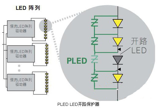 以上方案能夠有效的應(yīng)對電源部分產(chǎn)生的浪涌威脅,保護LED免受損壞。但是我們都知道,LED燈等通常由一定數(shù)量的LED管串接或并聯(lián)組成陣列,單個LED損壞會造成的整個LED陣列的停止工作。傳統(tǒng)的fuse、MOV、TVS并不能保障此類問題。因此在LED陣列端,LF專門為LED開路研制了PLED LED開路保護器,如圖所示: