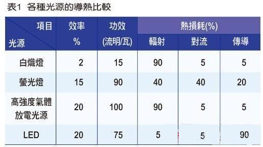在此情況下,約20%輸入功率轉(zhuǎn)換為光,80%則轉(zhuǎn)換為熱。這取決于多種因素,發(fā)熱可能與底層不規(guī)則以及聲子發(fā)射、密封、材料等有關(guān)。在LED產(chǎn)生的總熱量中,有90%透過傳導傳輸。表1為耗散來自LED接面的熱量,傳導是導熱的主要通道,因為對流和輻射僅占全部熱傳輸約10%。比如一個LED可能轉(zhuǎn)換近10.72瓦熱量(13.4瓦×0.8)。其中,9.648瓦(10.72瓦×0.9)透過傳導從LED接面?zhèn)鬏敾蜻w移。顯然,LED光源需要精確的功率和熱管理系統(tǒng),因為與其他光源相比,提供給LED的電能大部分轉(zhuǎn)換為熱量。如果沒有適當?shù)臒峁芾恚@種熱量會影響LED壽命和色彩輸出。同時由于LED驅(qū)動裝置屬于硅組件,很快就會失效,因此必須配備故障安全備用過電流保護裝置。