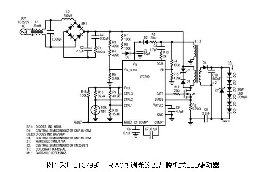 為了滿足脫機式照明的要求,例如高功率因子、高效率、隔離和TRIAC調光器兼容性,先前的LED驅動器采用很多外部分立式組件,結果形成了既龐大又復雜的解決方案。而最新的驅動器LT3799則整合了脫機式LED照明需要的所有功能,解決了相關復雜性、空間和效能問題。LT3799是一款具主動功率因子校正的隔離反馳式LED控制器,專門為在90~265VAC的通用輸入范圍驅動LED而設計。該組件以關鍵導通(邊界)模式控制一個隔離反馳式轉換器,適用于需要4~100瓦或更高LED功率的LED應用。其新穎的電流檢測電路無須使用光耦合器,就能向二次側提供良好調節的輸出電流。其獨特的泄能(Bleeder)電路使得LED驅動器可與TRIAC調光器兼容,而無須增設額外的組件。LED開路和短路保護則可確保長期可靠性。