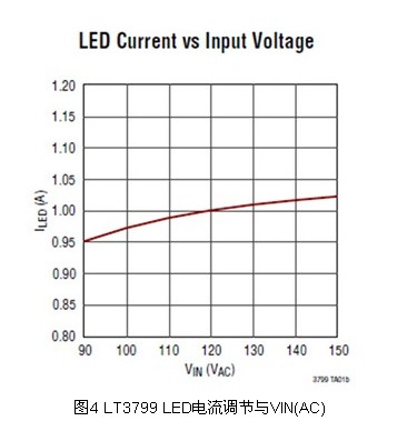 此外,LT3799在整個輸入電壓、輸出電壓和溫度范圍內提供LED電流調節。從圖4可見,正如大多數美國照明應用所要求,當輸入從90VAC變到150VAC時,LED電流保持在±5%的調節范圍內。LT3799采用一個獨特的電流檢測電路取代了光耦合器,以向二次側提供良好調節的電流。此舉不僅降低了成本,還改善了可靠性。