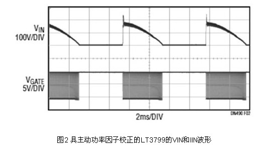 透過使線路電流跟隨施加的正弦波電壓,這種高功能整合的驅動電路實現了高功率因子,并且滿足了IEC 61000-3-2 C類照明設備諧波要求。如果所吸取的電流與輸入電壓成正比,就能實現等于1的功率因子。其用一個從輸入電壓產生并與輸入電壓成比例的電壓調制峰值開關電流。如圖2所示,這種方法提供0.98或更高的功率因子。一個小帶寬回饋環路保持對輸出電流的調節,而且不會使輸入電流失真。