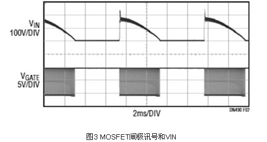當TRIAC調光器處于斷開狀態時,其實不是徹底斷開的。有相當大的漏電流通過其內部濾波器流至LED驅動器。這個電流為LED驅動器的輸入電容器充電,進而導致LED隨機開關和閃爍。過往的解決方案是增加一個泄能電路,該電路包括一個大且昂貴的高壓金屬氧化物半導體場效晶體管(MOSFET)。LT3799將變壓器一次側繞組和主開關用作泄能電路,因此無需這類MOSFET或其他任何額外的組件。如圖3所示,當TRIAC斷開時,MOSFET閘極訊號為高,且MOSFET接通,進而泄放掉漏電電流,并保持輸入電壓為 0伏特(V)。TRIAC一導通,MOSFET就無縫地變回正常的供電組件。