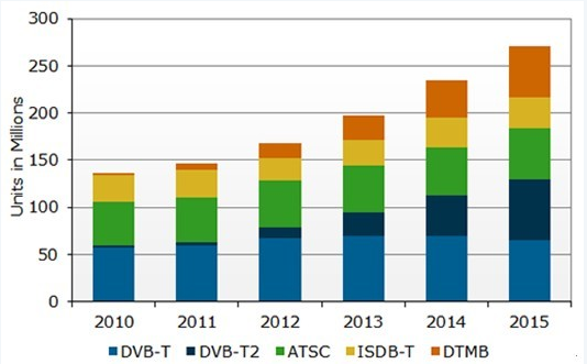報(bào)告指出許多關(guān)鍵國(guó)家都已經(jīng)引進(jìn)或者承諾引進(jìn)DVB-T2。預(yù)計(jì)到2015年,DVB-T2地面數(shù)字電視出貨量將從2011年的340萬(wàn)臺(tái)上升到6千4百70萬(wàn)臺(tái)。