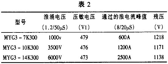 另外,表2 為一組Ф7、Ф10 或Ф14 等不同片徑的壓敏電阻器通流試驗情況,從表中可以看出,對于不同片徑的壓敏電阻器,其所能承受的浪涌電流也不一樣。通常,對于使用同一配方制作的壓敏電阻器,片徑越大,壓敏電阻器能承受的最大峰值電流也就越大,相應的殘壓也會有所增加,但其增加的程度遠遠低于通流的增加幅度。因此,選型時,應根據線路的耐壓水平,外界可能產生的電涌電壓,盡可能選擇通流比較大的壓敏電阻器,以保證線路長期持續的正常工作。