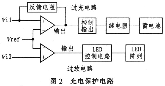 充電保護電路由兩個運算放大器組成,電路如圖2所示。圖2中Vi1、Vi2分別為蓄電池的輸出電壓,Vref為運算放大器的比較參考電壓,其具體值根據不同的要求由用戶設定。在實際設計過程中,要注意圖2中反饋電阻的選取,反饋電阻越大,控制輸出所對應的輸入Vi回差值越小。