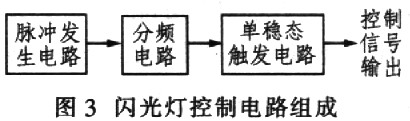 控制電路需要根據不同的要求進行不同的設計。對于閃光功能變化復雜的控制電路可使用MCU單片機進行控制,這樣控制方便、簡單、穩定。由于本系統設計只要求閃光燈定時閃爍,功能單一,故采用簡單的純硬件電路實現。電路組成如圖3所示。