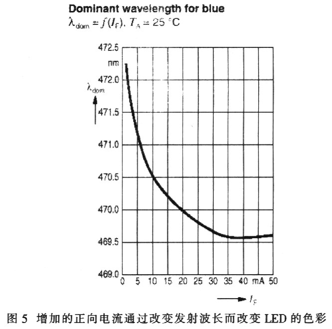 但是,采用InGaN技術的LED并不像標準綠光、紅光和黃光那樣容易控制。InGaN LED的顯示波長(色彩)會隨著正向電流而改變(如圖5所示)。例如,白光LED所呈現的色彩變化產生于轉換材料的不同濃度,且藍光發光InGaN材料隨著正向電壓的變化而產生波長變化。