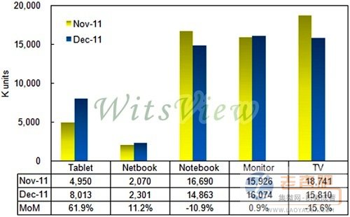 監(jiān)視器面板出貨量為1,607萬片,月增0.9%;筆記型電腦面板出貨量為1,486萬片,月減10.9%。平板電腦方面,WitsView指出,蘋果(Apple)新一代 iPad 3 面板,持續(xù)受到生產(chǎn)良率問題,造成目前供貨量依然受到限制,但華南地區(qū)對(duì)于山寨平板電腦需求,依舊強(qiáng)勁,整體平板電腦面板出貨較11月增加61.9%,出貨量來到801萬片。小筆電用面板出貨量則來到230萬片,較上月增加11.2%。