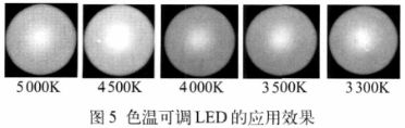 集成封裝的LED,由于工作電流較大,工作時(shí)產(chǎn)生大量的熱量,積聚在pn 結(jié)內(nèi)部的熱如不及時(shí)傳導(dǎo)出去,將導(dǎo)致器件溫度升高,溫度對(duì)LED的性能產(chǎn)生重要的影響,如色溫變化、波長(zhǎng)紅移、正向壓降等。圖5 所示為色溫可調(diào)LED的應(yīng)用效果,將封裝好的色溫可調(diào)LED模塊安裝到100mm筒燈上,紅光LED加上不同的電流,得到筒燈的發(fā)光效果。筒燈連續(xù)點(diǎn)亮30min 后,測(cè)試筒燈上散熱器溫度為38℃,鋁基覆銅板上的溫度為38.5℃(室溫25.2℃),說明色溫可調(diào)LED 具有良好的散熱性能。